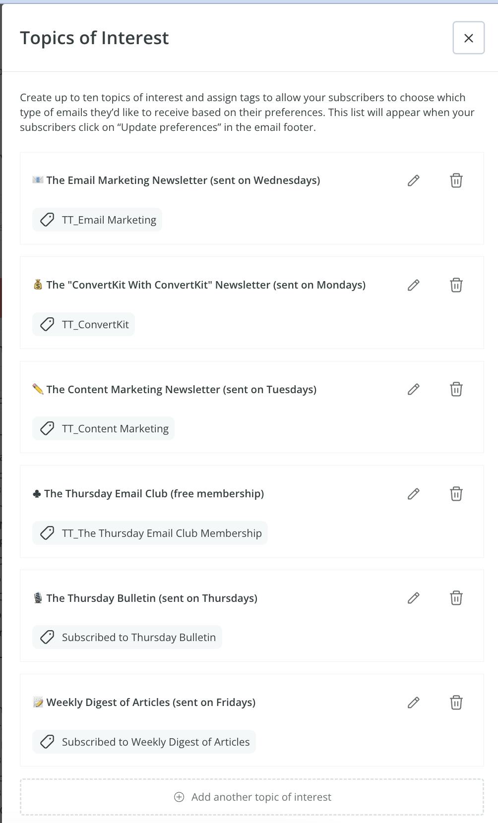 In the image above, you can see a few of the ‘Topics of Interest‘ that I have in my ConvertKit configuration.